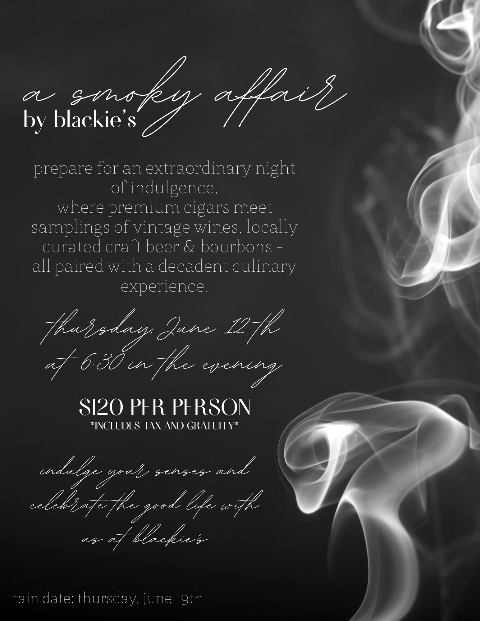 Join us for A Smoky Affair at Blackie’s, an unforgettable culinary experience where: